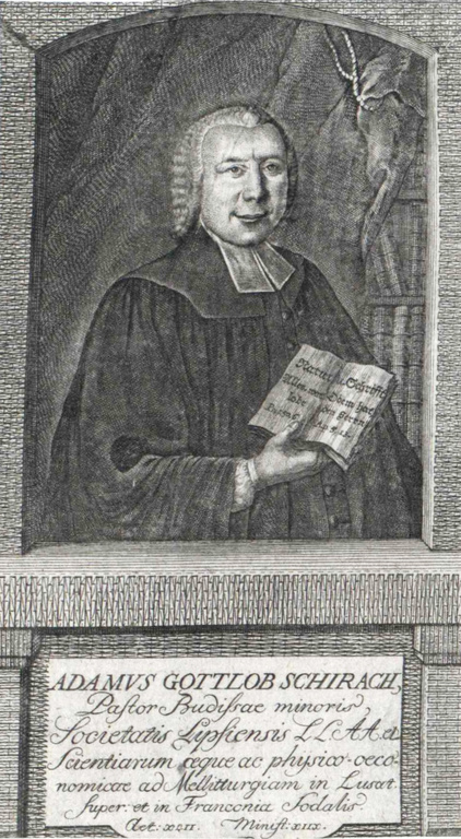 Adam Gottlob Schirach wurde 1724 in Nostitz in der Lausitz geboren. Er war nicht nur Geistlicher, sondern erforschte auch mit Leidenschaft die Natur. Speziell die Bienenvölker. Mit seiner Neugier und ausgeprägten Beobachtungsgabe gelang ihm eine bahnbrechende Erkenntnis: Nicht etwa ein „König“ regierte im Bienenstock, sondern die Bienenkönigin, das einzig fruchtbare Weibchen. Schirach fand zudem heraus, dass Bienenvölker mit Hilfe isolierter Brutwabenstücke künstlich vermehrt werden können. Diese Methode ermöglichte es Imkern, neue Völker zu bilden, ohne auf den natürlichen Schwarmbetrieb angewiesen zu sein und machte die Bienenzüchter damit unabhängiger. Nicht lange, und Schirachs bahnbrechende Entdeckung „schwärmte“ aus in alle Welt. Sorgfältig trug er seine Beobachtungen in umfangreichen Schriften zusammen und legte damit das Fundament für die moderne Bienenhaltung. 1766 gründete Schirach die erste Bienengesellschaft, in der Oberlausitz. Selbst über Europa hinaus ist Schirach heute ein Name. Gottlob Adam Schirach – Sachse und der erste Imkerforscher von internationalem Rang.